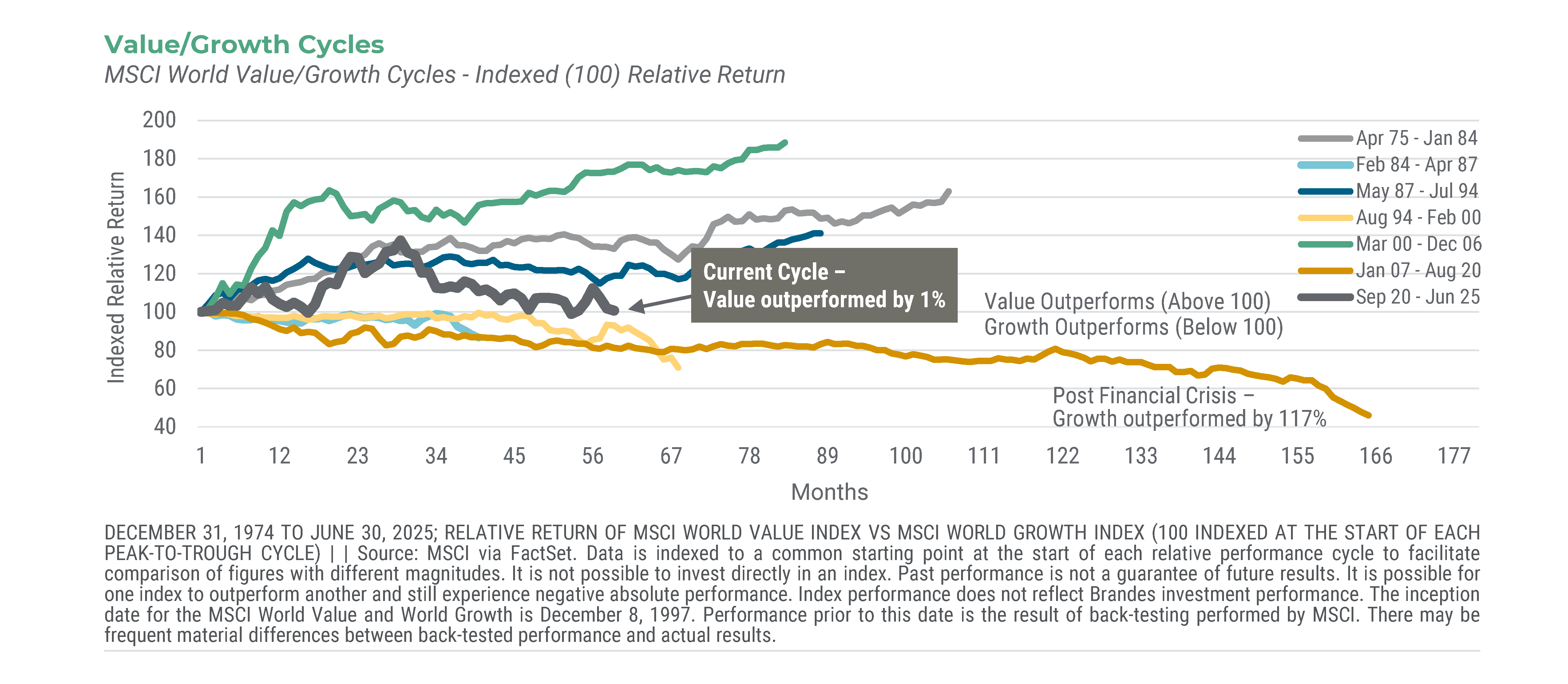 Pfizer Monday in late 2020 marked a turning point for value stocks,1 ending growth stocks’ longest stretch of outperformance in history and ushering in a resurgence in value. While value has led since then, the path has been volatile and the performance gap has been narrow: For the period from 9/30/20 to 6/30/25, value outpaced growth by just 1% cumulatively (MSCI World Value vs. MSCI World Growth).